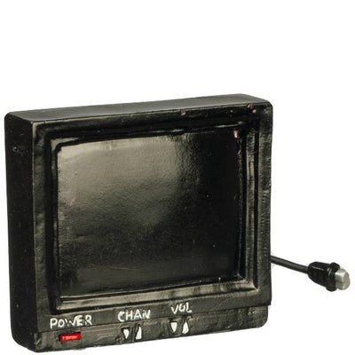 This black mini TV is 1/12 scale, which is the most common scale for dollhouses and dollhouse miniatures. It means that if an object is 12 inches in real life, it is sized down to a one inch as a miniature. It measures 1.875" H x 2" W x 1" D.